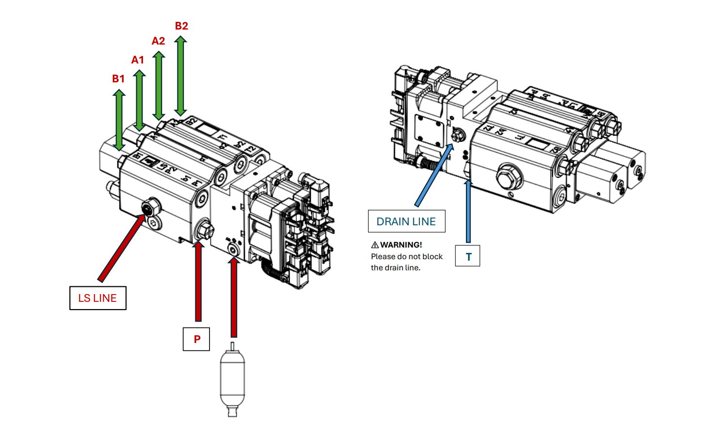 Tre hydraulikklinjer (P, T, P1) kobler LOAD SENSING-proporsjonalventilen til traktorens hydraulikksystem: