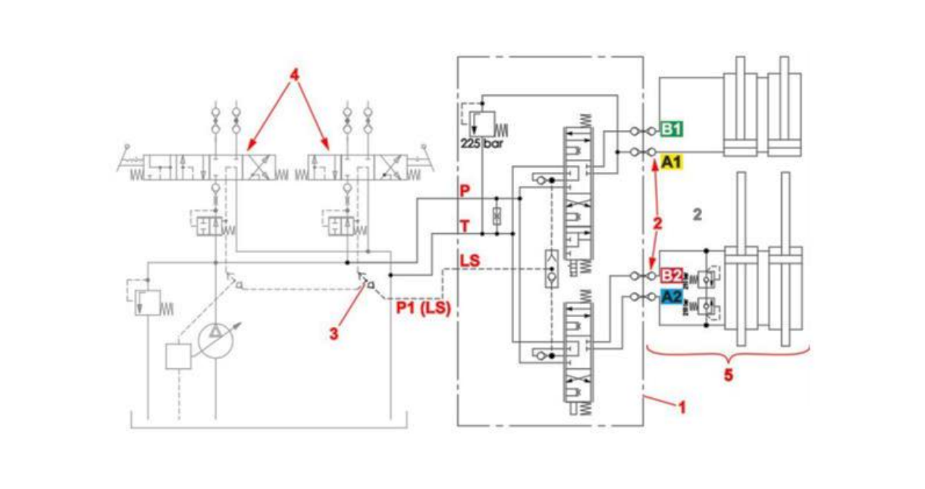Diagrammet viser et LOAD SENSING hydraulikksystem: