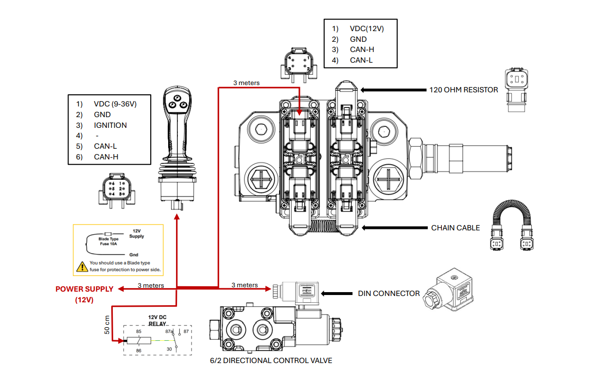 Sett inneholder ventilen, en proporsjonal kontrolljoystick og elektrisk ledningsnett.