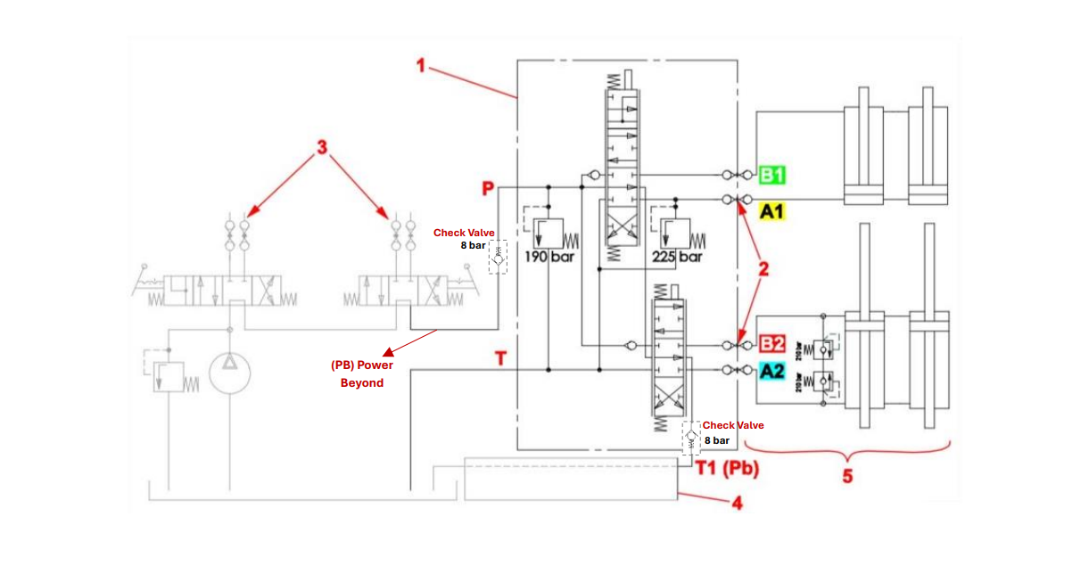 - T1 – trycköverföring (Power Beyond – ”PB”) + 8 bar fjäderbelastad backventil