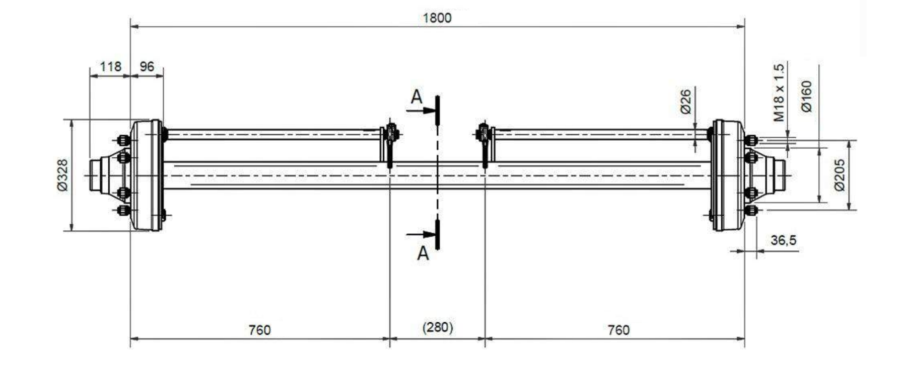 AXEL FÖR SLÄPVAGN MED BROMSAR (6 SKRUVAR) - 7200 kg - 1800 mm